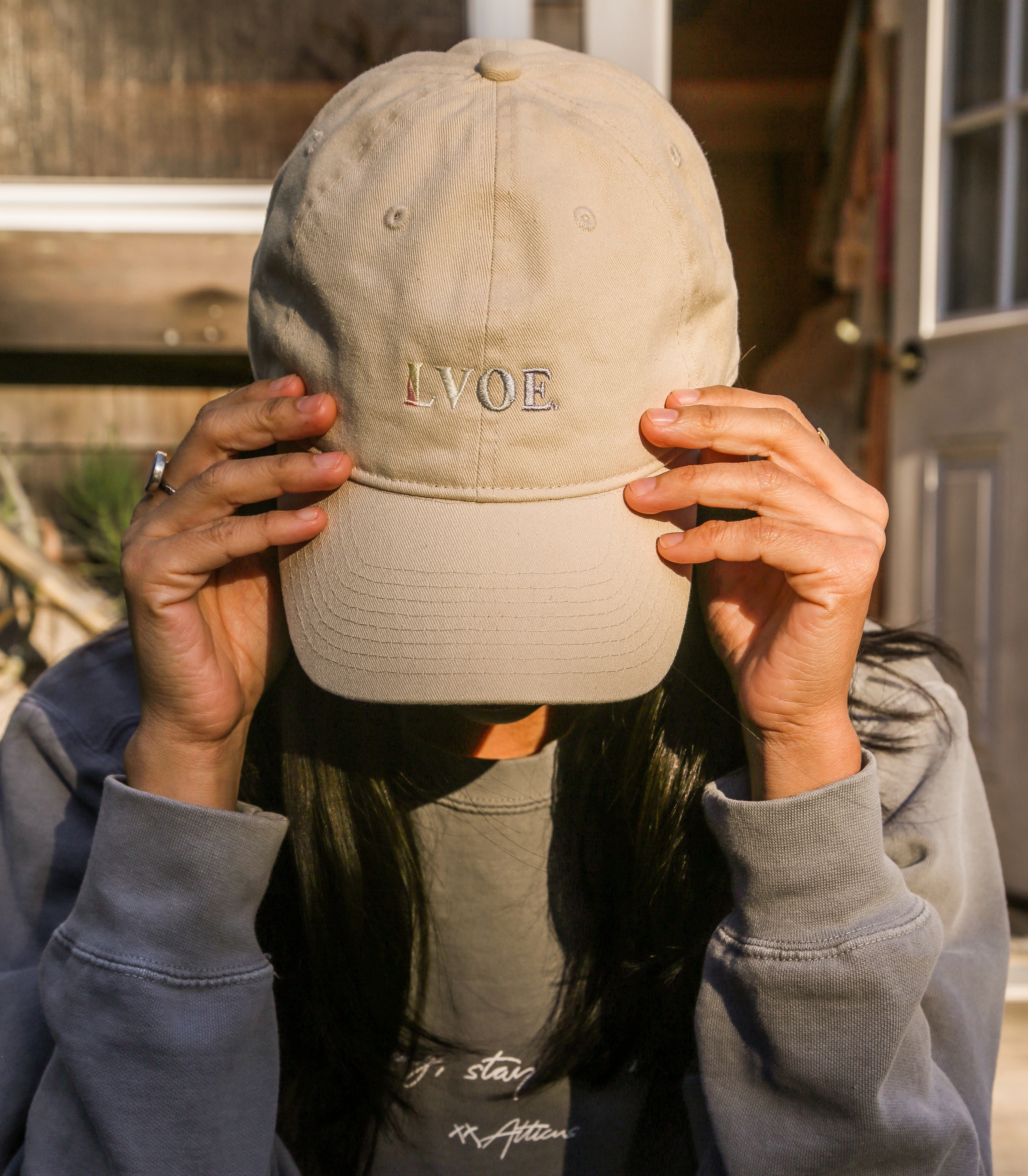 Our LVOE baseball cap in our bestselling khaki pigment-dyed cotton twill embroidered in a beautiful soft tie-dye thread. This cotton hat combines durability, comfort, and timeless style, making it a perfect accessory for everyday wear.