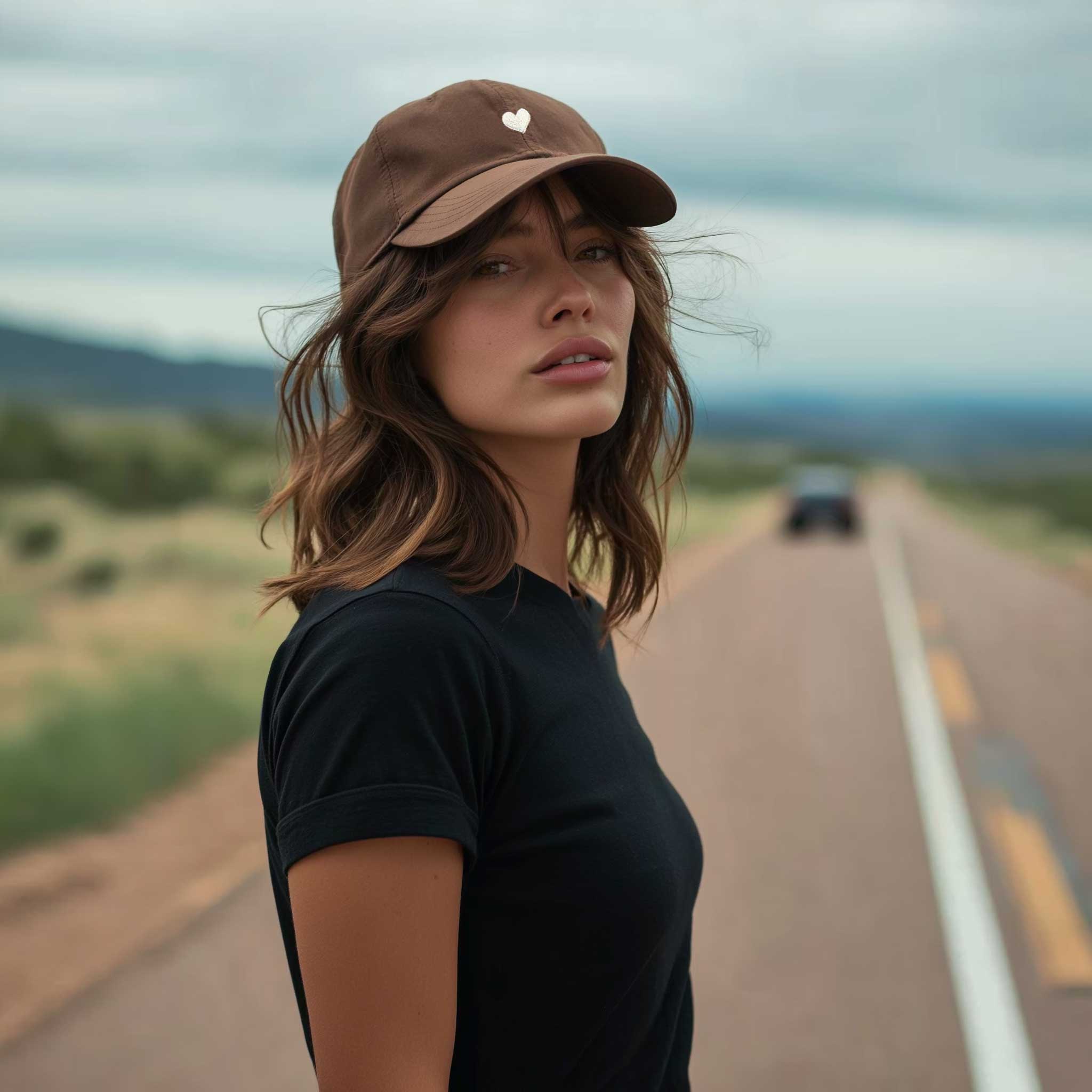The Embroidered Heart Cap is a bestselling mocha pigment-dyed cotton cap, embroidered with a heart on the front and "LOVE HER BUT LEAVE HER WILD" on the right side. This brushed cotton hat combines durability, comfort, and timeless style, making it a must-have accessory for everyday wear.