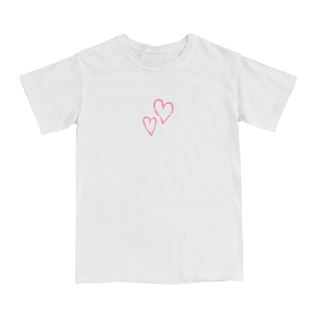 White tee with double hearts printed on front chest and "She was just my kind of crazy" printed on back.